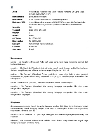 Judul Menaker Ida Fauziyah Tulis Surat Terbuka Mengenai UU Cipta Kerja,