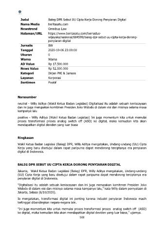 Judul Baleg DPR Sebut UU Cipta Kerja Dorong Penyiaran Digital