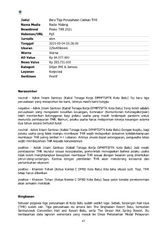 (THR) sudah cair. Tiga perusahaan itu antara lain 'Ihe Singhasari Resort Batu, kemudian