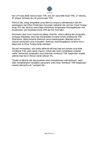 Dari 274 yang tidak mampu bayar THR, ada 167 yang tidak bayar THR, 27 ditunda,