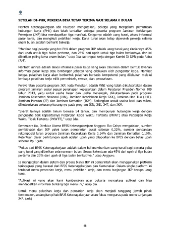 "Manfaat bagi pekerja yang ter-PHK dalam program JKP adalah uang tunai yang rinciannya 45%