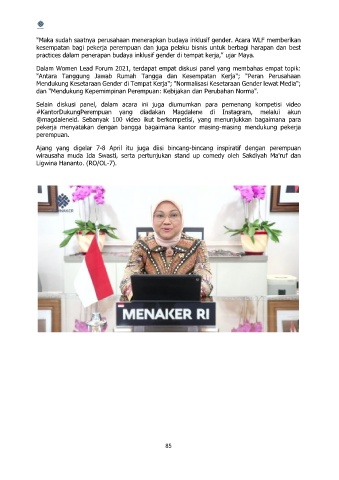 "Maka sudah saatnya perusahaan menerapkan budaya inklusif gender. Acara WLF memberikan