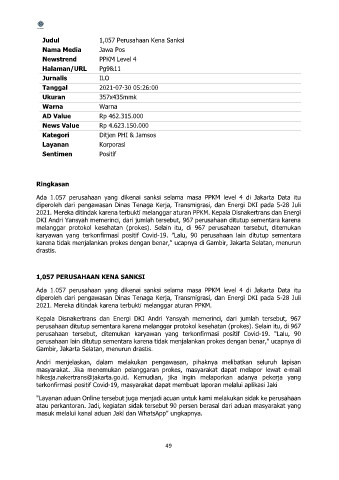 Ada 1.057 perusahaan yang dikenai sanksi selama masa PPKM level 4 di Jakarta Data itu
