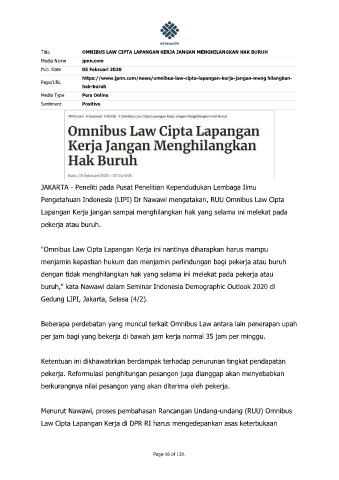 Pengetahuan Indonesia (LIPI) Dr Nawawi mengatakan, RUU Omnibus Law Cipta
