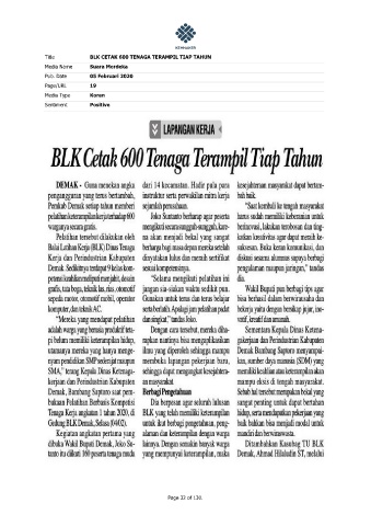 Title BLK CETAK 600 TENAGA TERAMPIL TIAP TAHUN Media Name Suara Merdeka Pub. Date 05 Februari 2020 Page/URL 19 Media Type Koran Sentiment Positive Page 32 of 130.