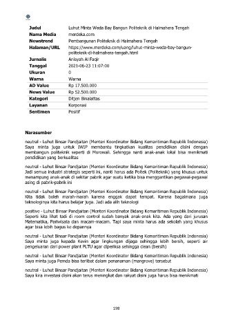 Judul Luhut Minta Weda Bay Bangun Politeknik di Halmahera Tengah