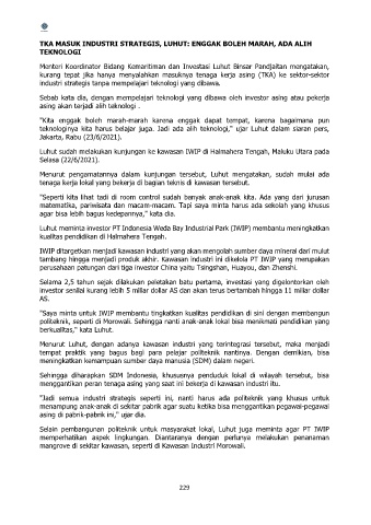 Luhut meminta investor PT Indonesia Weda Bay Industrial Park (IWIP) membantu meningkatkan