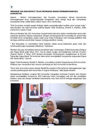 Menaker Ida juga menyatakan bahwa pemerintah akan membangun 25 BLK Komunitas di Papua