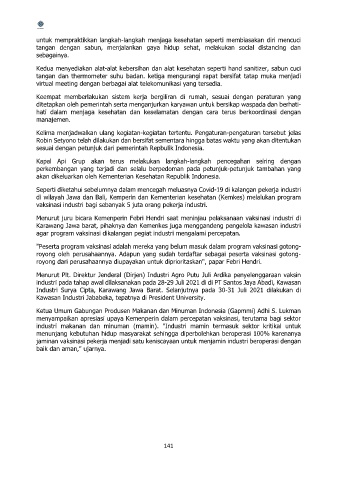 menyampaikan apresiasi upaya Kemenperin dalam percepatan vaksinasi, terutama bagi sektor