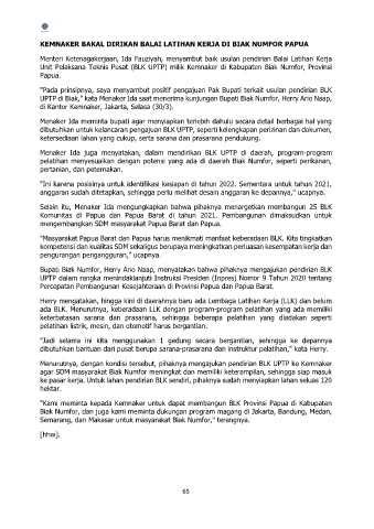 UPTP di Biak," kata Menaker Ida saat menerima kunjungan Bupati Biak Numfor, Herry Ario Naap,