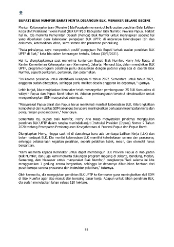 BUPATI BIAK NUMFOR BARAT MINTA DIBANGUN BLK, MENAKER BILANG BEGINI