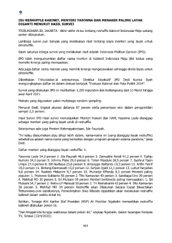 Hasil Survei IPO Hasil survei menunjukkan Menteri Hukum dan HAM, Yasonna Laoly dianggap
