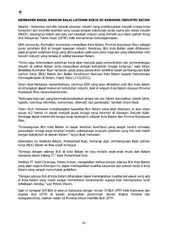 pionir pendirian BLK di tengah kawasan industri. Nantinya, BLK Kota Batam akan difokuskan