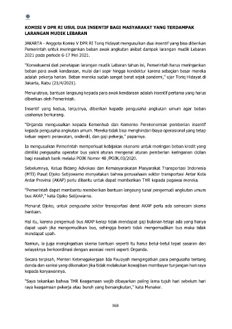 Pemerintah untuk meringankan beban awak angkutan akibat dampak larangan mudik Lebaran