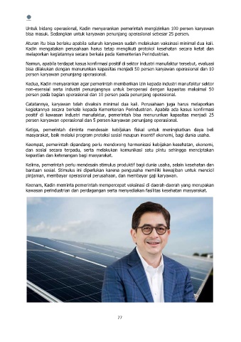 Untuk bidang operasional, Kadin menyarankan pemerintah mengizinkan 100 persen karyawan