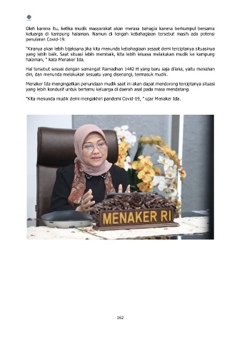 "Kita menunda mudik demi mengakhiri pandemi Covid-19, " ujar Menaker Ida.