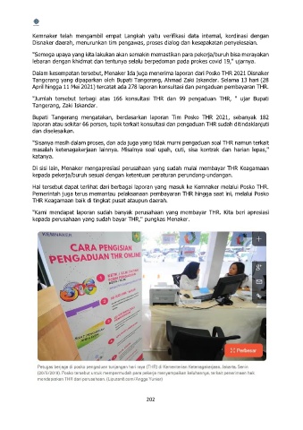 Dalam kesempatan tersebut, Menaker Ida juga menerima laporan dari Posko THR 2021 Disnaker