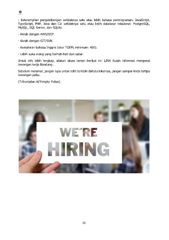 - Keterampilan pengembangan setidaknya satu atau lebih bahasa pemrograman: JavaScript,