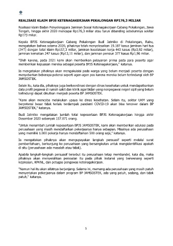 REALISASI KLAIM BPJS KETENAGAKERJAAN PEKALONGAN RP176,3 MILIAR