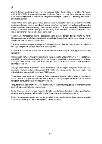 penegakan hukum terkait pelaksanaan THR 2021. Dia mengingatkan terdapat sanksi bila
