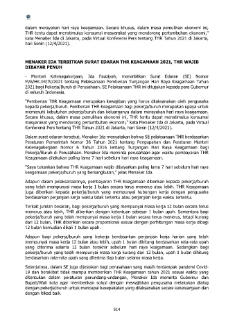 - Menteri Ketenagakerjaan, Ida Fauziyah, menerbitkan Surat Edaran (SE) Nomor