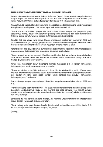 dengan keputusan Menteri Ketenagakerjaan Ida Fauziyah mengeluarkan Surat Edaran (SE)