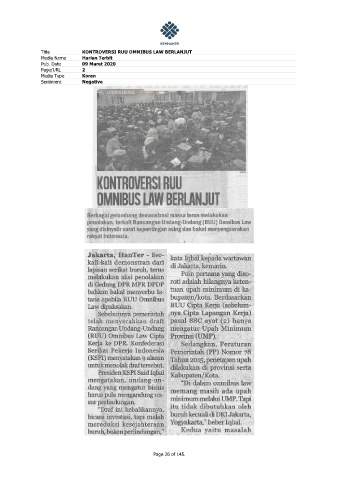 Title KONTROVERSI RUU OMNIBUS LAW BERLANJUT Media Name Harian Terbit Pub. Date 09 Maret 2020 Page/URL 2 Media Type Koran Sentiment Negative Page 26 of 145.