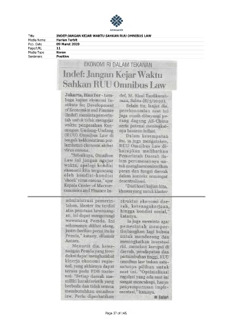 Title INDEF:JANGAN KEJAR WAKTU SAHKAN RUU OMNIBUS LAW Media Name Harian Terbit Pub. Date 09 Maret 2020 Page/URL 11 Media Type Koran Sentiment Positive Page 37 of 145.