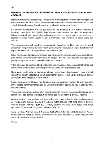 Hal tersebut disampaikan Menaker Ida Fauziyah saat meninjau PT Bio Farma (Persero) di