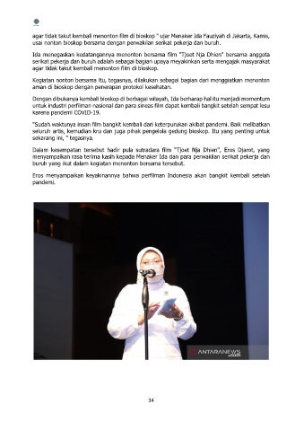 agar tidak takut kembali menonton film di bioskop " ujar Menaker Ida Fauziyah di Jakarta, Kamis,