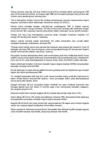 Potensi pertama, kata dia, ILO bisa mendorong kontribusi terhadap sistem pembangunan PBB