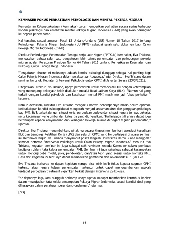 seminar bertema "Intervensi Psikologis untuk Calon Pekerja Migran Indonesia." Menurut Eva