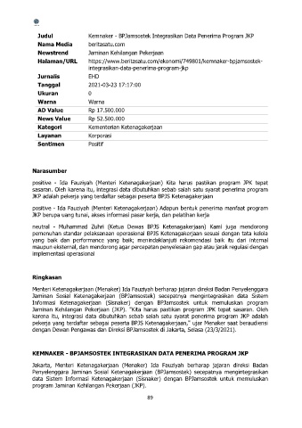 Judul Kemnaker - BPJamsostek Integrasikan Data Penerima Program JKP