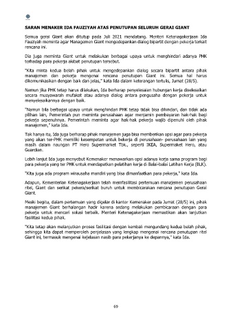 SARAN MENAKER IDA FAUZIYAH ATAS PENUTUPAN SELURUH GERAI GIANT