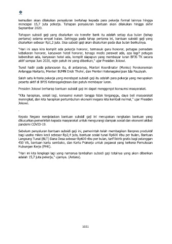 disalurkan sebesar Rp1,2 juta. Sisa subsidi gaji akan disalurkan pada dua bulan berikutnya.