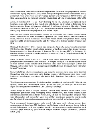 investor dari Jepang. Dijelaskan Luhut, untuk meningkatkan perekonomian Indonesia ke depan,
