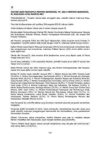 (54,06%); 2. Menteri Ketenagakerjaan, Ida Fauziyah (46%); 3. Menteri Pemuda dan Olahraga,