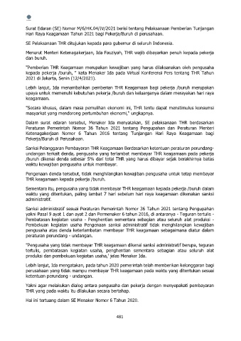 Surat Edaran (SE) Nomor M/6/HK.04/IV/2021 berisi tentang Pelaksanaan Pemberian Tunjangan