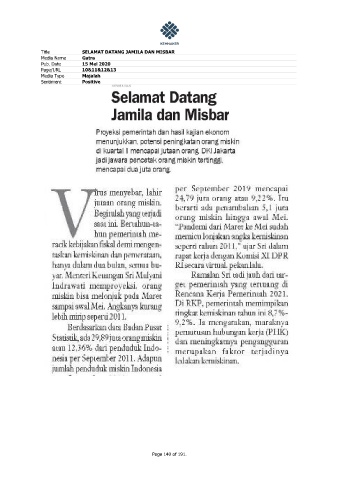 Title SELAMAT DATANG JAMILA DAN MISBAR Media Name Gatra Pub. Date 15 Mei 2020 Page/URL 10&11&12&13 Media Type Majalah Sentiment Positive Page 140 of 191.