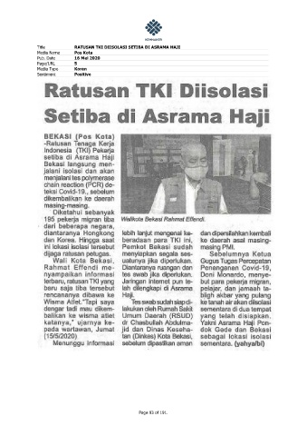 Title RATUSAN TKI DIISOLASI SETIBA DI ASRAMA HAJI Media Name Pos Kota Pub. Date 16 Mei 2020 Page/URL 5 Media Type Koran Sentiment Positive Page 93 of 191.