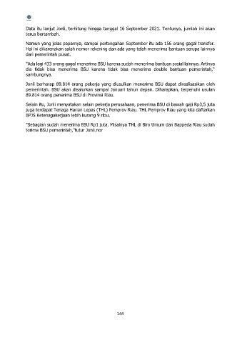 "Sebagian sudah menerima BSU Rp1 juta. Misalnya THL di Biro Umum dan Bappeda Riau sudah