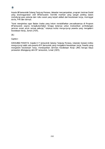 mengunjungi salah satu peserta B P Jamsostek yang mengalami kecelakaan kerja. Peserta yang
