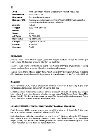 positive - Erick Thohir (Menteri Badan Usaha Milik Negara) Bantuan sebesar Rp 600 ribu per
