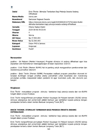 positive - Erick Thohir (Menteri BUMN) Hal ini penting untuk menggerakkan perekonomian dan