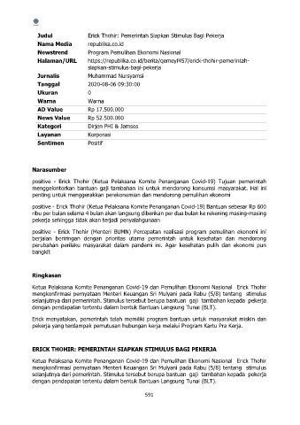 Judul Erick Thohir: Pemerintah Siapkan Stimulus Bagi Pekerja