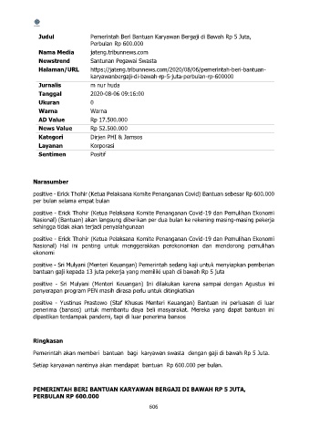 positive - Erick Thohir (Ketua Pelaksana Komite Penanganan Covid) Bantuan sebesar Rp 600.000
