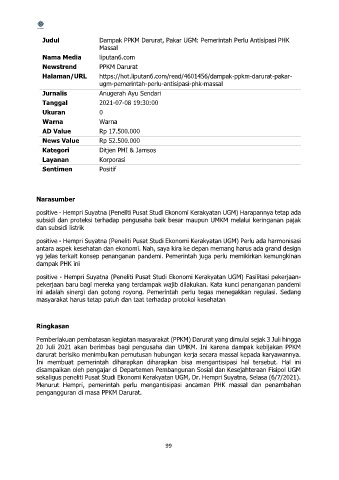 Judul Dampak PPKM Darurat, Pakar UGM: Pemerintah Perlu Antisipasi PHK