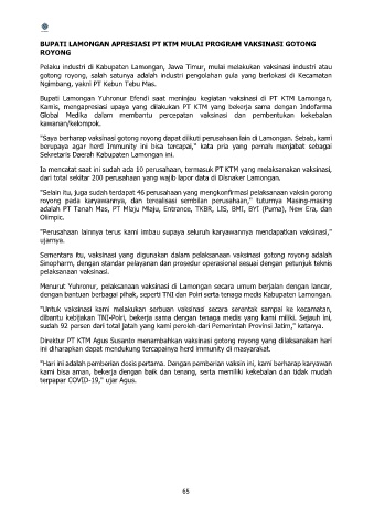 BUPATI LAMONGAN APRESIASI PT KTM MULAI PROGRAM VAKSINASI GOTONG