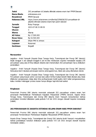 Judul 202 perusahaan di Jakarta ditindak selama enam hari PPKM Darurat