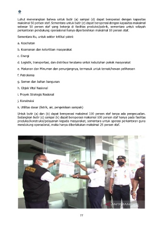 maksimal 50 persen staf. Sementara untuk butir (e) dapat beroperasi dengan kapasitas maksimal
